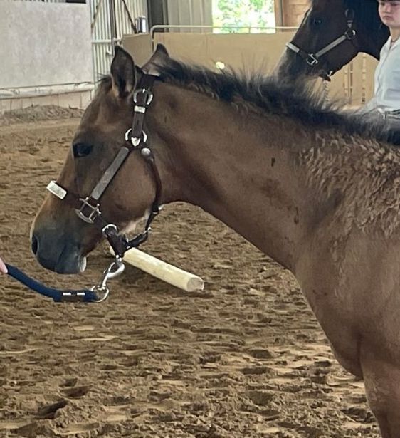 ‚Mark‘ ist ein sehr liebes und umgängliches Fohlen. Er lässt sich problemlos im Schritt und Trab führen, gibt die Hufe und lässt sich putzen.